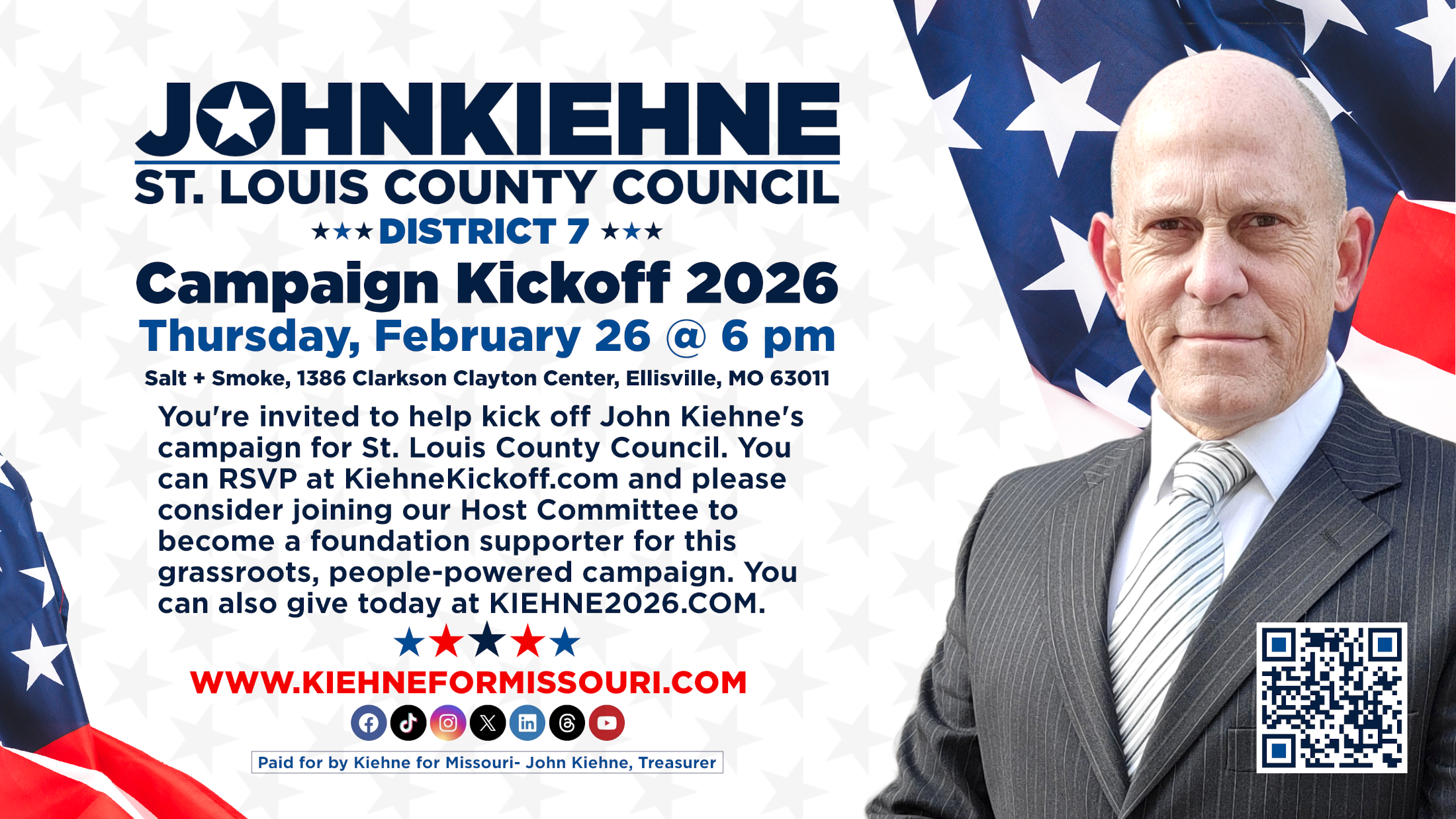 You're invited to help kick off John Kiehne's 2026 campaign for the St. Louis County Council's 7th District seat. Please RSVP, show up and bring some friends, and consider joining our Host Committee to become a foundation supporter for this grassroots, people-powered campaign. If we work together and support one another we can earn a victory in West St. Louis County in November! Let's unseat 10-year incumbent Councilman Mark Harder and put a voice for the residents of West St. Louis County on the St. Louis County Council who will put the needs and concerns of families over developers who are looking for a free ride on the taxpayers’ dime. RSVP Today!!!